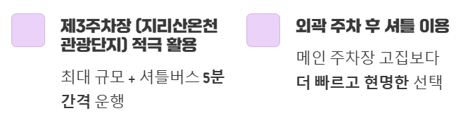 | 제3주차장 (지리산온천관광단지 내) | 가장 큰 규모, 셔틀 연계 최적 | 약 1,000대 | 셔틀 이용 |