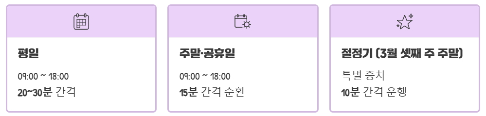 - 절정기(3월 셋째 주 주말): 방문객 집중을 고려해 10분 간격으로 특별 증차 운행 예정이에요.