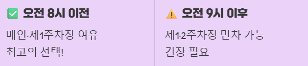 - ✅ 오전 8시 이전 도착: 이른 아침에 도착하면 메인 주차장이나 제1주차장에 여유가 많아요.
