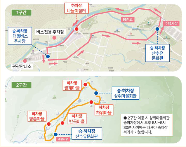 - B노선: 구례구역 광장 → 섬진강변 주차장 → 온천관광단지 정문 → 산수유문화관 → 축제 메인무대