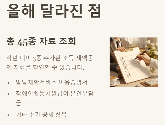 - ✅ 총 45종의 공제 자료가 제공되며, 발달재활서비스 등 3종이 추가되었습니다.