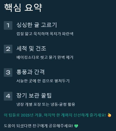 - 4. 🧊 장기 보관 꿀팁: 냉장 시에는 키친타월로 개별 포장 후 밀폐 용기에, 더 길게는 냉동 보관이나 귤청으로 활용해보세요!