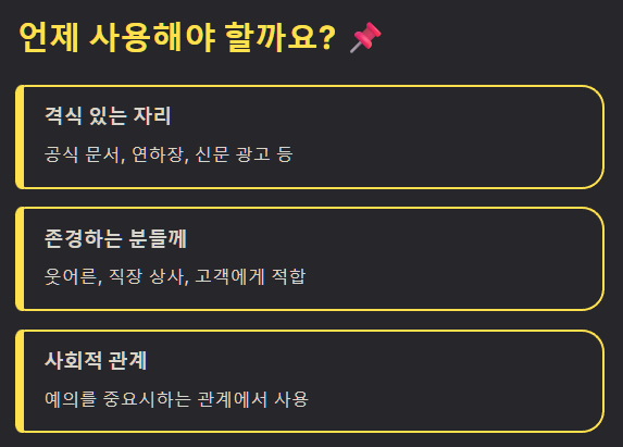 • 아랫사람이나 아주 친한 친구 등 격식을 차릴 필요가 없는 관계에서는 어색하게 느껴질 수 있습니다.