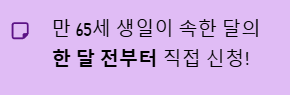만 65세 생일이 속한 달의 한 달 전부터 아래 기관들을 통해 직접 신청해야 합니다.