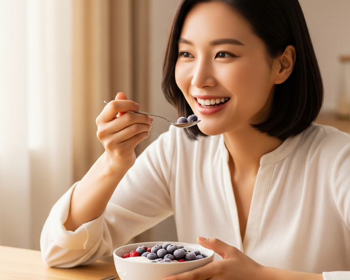 요거트 토핑: 플레인 요거트에 냉동 블루베리 몇 알을 올리면, 요거트의 찬 기운에 블루베리가 서서히 녹으면서 상큼한 맛을 더해줘요.
