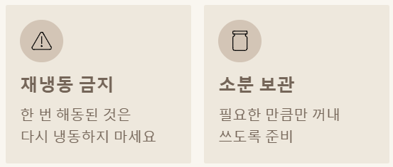• 재냉동은 절대 금지! 한 번 해동된 것은 바로 드시거나 소분해서 보관하는 것이 현명해요.