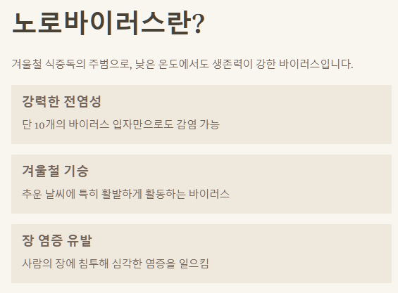 1. 노로바이러스는 겨울철 식중독의 주범으로, 소량으로도 쉽게 감염되는 강력한 전염성을 가집니다.