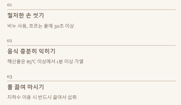 3. 오염된 해산물, 물, 그리고 사람 간 접촉이 주된 감염 원인이니, 특히 날것 섭취를 조심해야 해요.