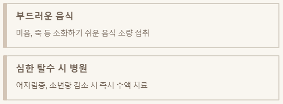 - 심한 탈수 증상 시 병원 방문: 어지럼증, 극심한 무기력감, 소변량 감소 등 심각한 탈수 증상이 나타나면 즉시 병원에 가서 수액 치료를 받아야 합니다.
