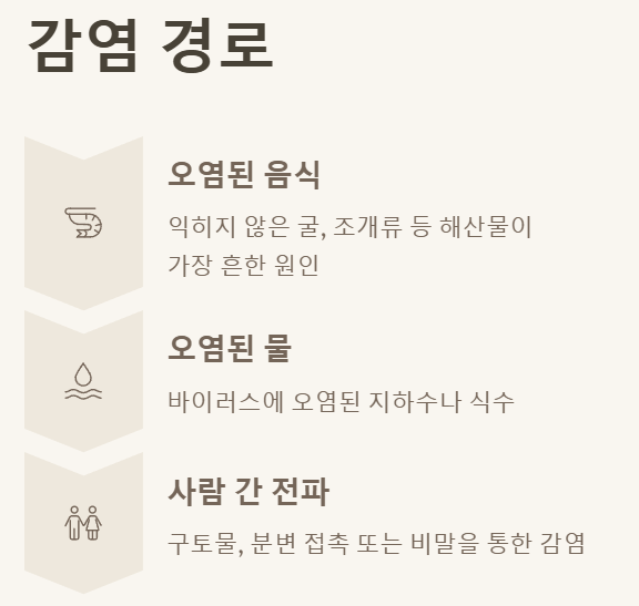 - 사람 간 전파: 감염자의 구토물이나 분변에 접촉하거나, 감염자와 식기를 공유하는 등의 직접적인 접촉을 통해 쉽게 전파돼요. 비말을 통해서도 감염될 수 있습니다.