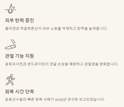 | 주요 성분 | IGF-1, 글루코사민, 콘드로이틴 | 성장, 관절, 연골 건강에 핵심 역할 |