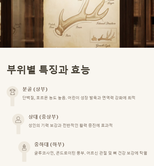 - 분골(상부): 단백질, 아미노산, 호르몬 농도가 높아 어린이 성장 발육과 면역력 강화에 특히 좋습니다.