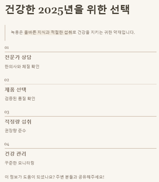 녹용에 대한 정보가 여러분의 건강 관리에 도움이 되셨기를 바랍니다. 현명한 선택으로 건강하고 활기찬 2025년을 보내세요!