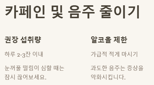 너무 당연한 이야기일 수 있지만, 커피는 하루 2~3잔 이내로 줄이고, 술은 가급적 적게 마시는 것이 좋아요. 특히 눈꺼풀 떨림이 심할 때는 잠시 끊어보는 것도 좋은 방법입니다.