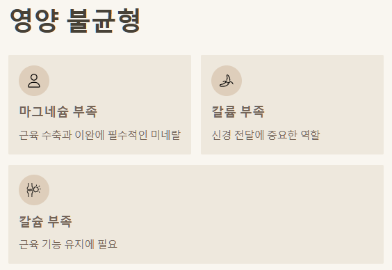 - 마그네슘 중요: 마그네슘 부족이 주요 원인 중 하나이므로, 보충이 도움이 될 수 있습니다.