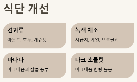 마그네슘이 풍부한 음식(견과류, 녹색 잎채소, 바나나, 다크 초콜릿)을 충분히 섭취하는 것이 좋습니다. 음… 만약 식단으로 보충이 어렵다면, 의사나 약사와 상담 후 마그네슘 영양제를 섭취하는 것도 좋은 방법이에요.
