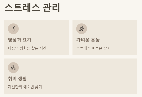 스트레스를 아예 없앨 수는 없겠지만, 관리하는 방법을 찾는 게 중요해요. 명상, 요가, 가벼운 운동, 취미 생활 등 자신에게 맞는 스트레스 해소법을 찾아 꾸준히 실천해 보세요. 저 같은 경우는 퇴근 후에 좋아하는 음악을 들으면서 산책하는 게 큰 도움이 되더라고요.