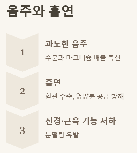 과도한 음주와 흡연 역시 눈떨림의 원인이 될 수 있어요. 알코올은 몸속의 수분과 마그네슘 배출을 촉진하고, 니코틴은 혈관을 수축시켜 영양분 공급을 방해하죠. 이 모든 것이 신경과 근육의 기능을 저하시켜 눈떨림을 유발할 수 있습니다. 건강을 위해서라도 줄이는 것이 좋겠죠?