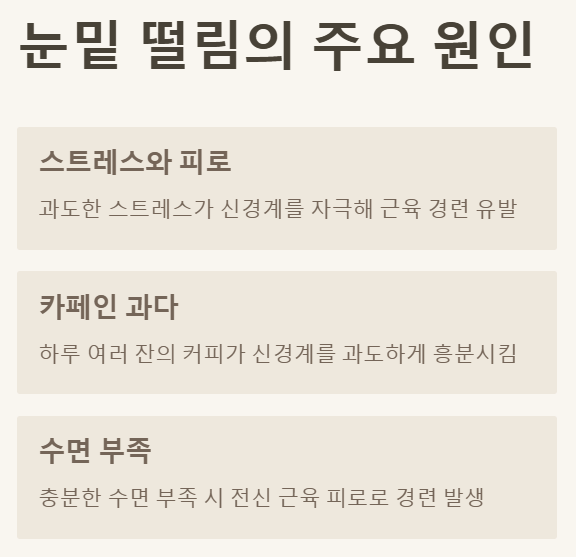 • 1. 대부분의 눈밑 떨림은 스트레스, 피로, 카페인, 마그네슘 부족 등 일시적인 원인 때문입니다.