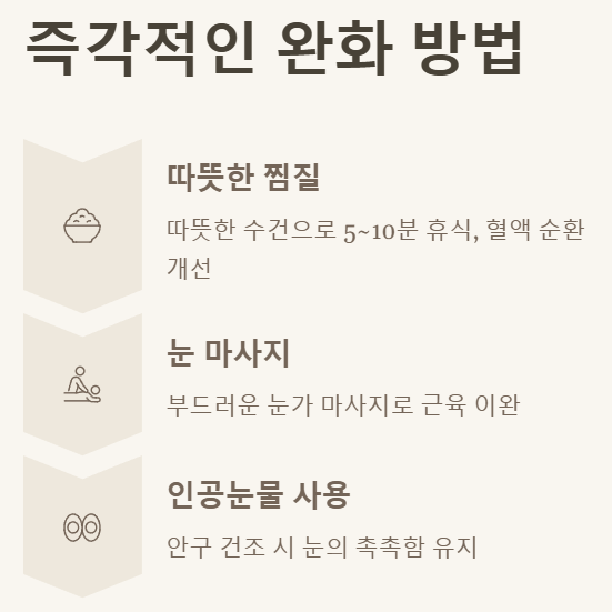 • 따뜻한 찜질 및 눈 마사지: 피로한 눈에 따뜻한 수건을 얹고 5~10분 정도 휴식을 취하면 혈액 순환이 좋아지고 근육 이완에 도움이 됩니다. 부드러운 눈가 마사지도 긴장 완화에 효과적이에요.