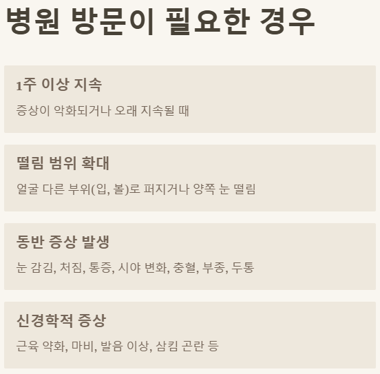 위 표에서 '즉시 병원 방문 권장'에 해당하는 증상이 나타난다면, 단순한 피로가 아닌 안면 경련, 눈꺼풀 경련(Blepharospasm), 또는 드물게는 뇌 신경계 질환의 신호일 수 있습니다. 망설이지 말고 신경과나 안과 전문의를 찾아 정확한 진단을 받아보세요.