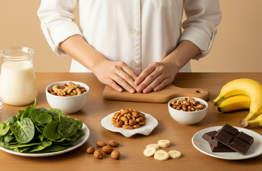 A1: 마그네슘이 풍부한 음식이 좋습니다. 견과류(아몬드, 호두), 씨앗류(해바라기씨, 호박씨), 녹색 잎채소(시금치, 케일), 바나나, 콩류, 통곡물 등이 대표적이에요. 다크 초콜릿에도 마그네슘이 들어있으니 참고하세요!