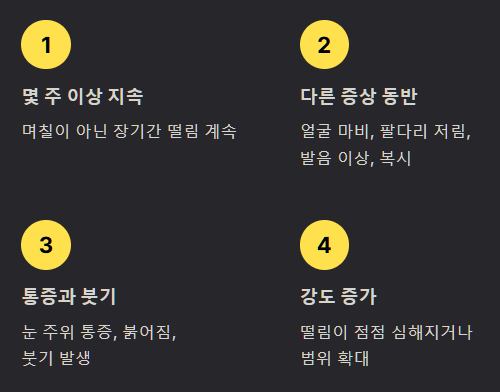 - 지속 기간: 며칠이 아니라 몇 주 이상 눈밑 떨림이 계속될 때.