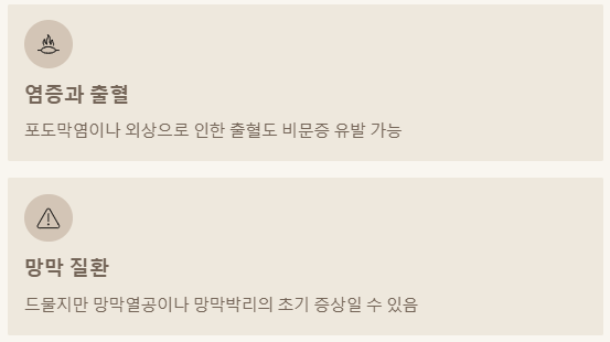 - 망막열공 또는 망막박리: 매우 드물지만, 비문증은 망막에 구멍이 생기거나 망막이 떨어지는 심각한 안질환의 초기 증상일 수도 있어요. 이 경우는 정말 정말 빨리 병원에 가봐야 해요.