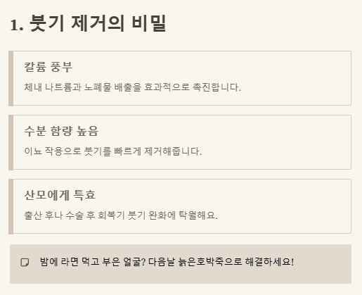 1. 뛰어난 붓기 제거 및 이뇨 작용: 칼륨이 풍부해 체내 나트륨과 노폐물 배출에 탁월합니다.