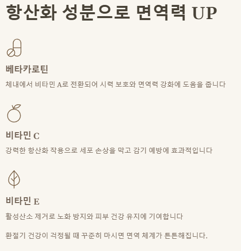 | ✅ 면역력 강화를 원하는 분들 | 베타카로틴 등 항산화 성분으로 면역 체계 강화 |