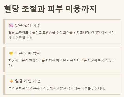 3. 장 건강과 혈당 관리에도 도움 🍎📉: 식이섬유가 장 운동을 돕고, 낮은 GI 지수로 혈당 조절에 유리해요.