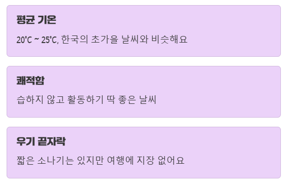 - 습도: 비교적 높지만, 건기 초입이라 한여름보다는 훨씬 쾌적한 편입니다.