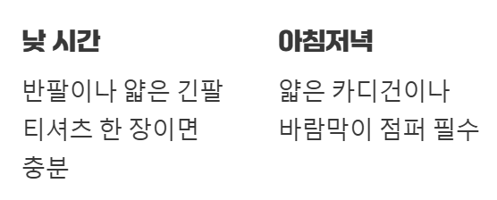 • 하의: 반바지, 긴바지 모두 가능해요. 다만, 저녁에는 긴바지가 더 따뜻할 거예요.