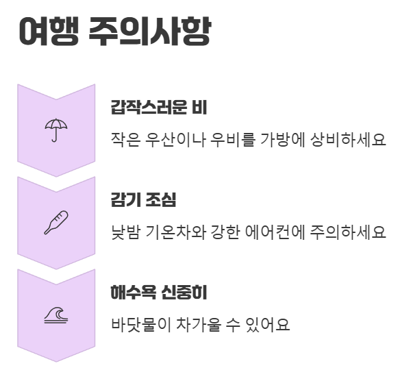 • 갑작스러운 비에 대비: 비 예보가 없어도 언제든 소나기가 내릴 수 있어요. 작은 우산이나 우비는 가방에 상비하는 것이 좋습니다.