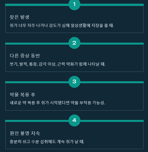 - 잦은 발생: 쥐가 너무 자주 나거나, 강도가 심해져 일상생활에 지장을 준다면 병원을 방문해 보세요.
