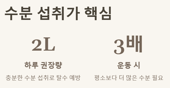 - 충분한 수분 섭취: 하루 2리터 이상의 물을 마시는 것이 좋아요. 특히 운동 전후나 더운 날씨에는 더 신경 써야 합니다.