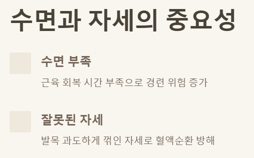 - 생활 습관 개선: 규칙적인 스트레칭, 편안한 신발, 충분한 수면으로 예방하는 것이 최선입니다.