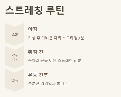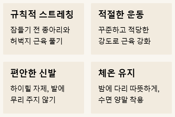 - 규칙적인 스트레칭: 특히 잠자리에 들기 전이나 운동 전후에 종아리와 허벅지 근육을 스트레칭 해주는 것이 중요해요.