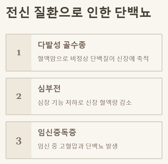 신장 자체는 문제가 없지만, 다른 질병들이 신장에 부담을 주어 단백뇨를 유발하는 경우도 있어요.
