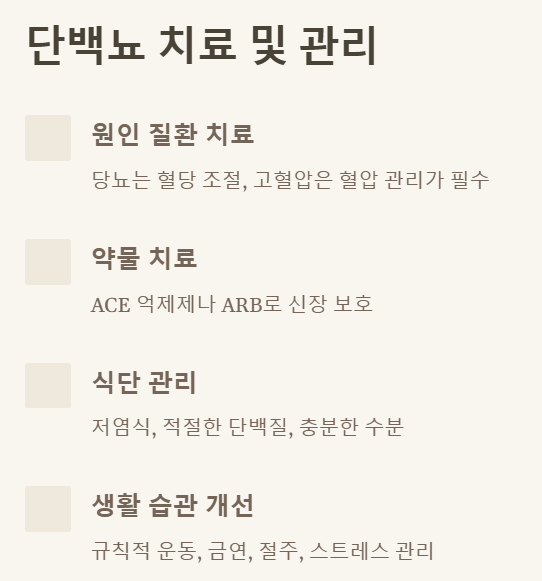 - ✅ 정확한 진단(소변, 혈액, 필요 시 신장 조직 검사)을 통해 원인을 파악하고, 원인 질환 치료와 함께 생활 습관 개선이 중요합니다.