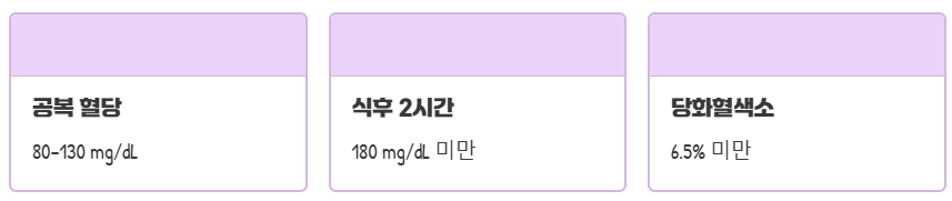 일반적으로 공복 혈당 80~130mg/dL, 식후 2시간 혈당 180mg/dL 미만, 당화혈색소 6.5% 미만을 목표로 해요.