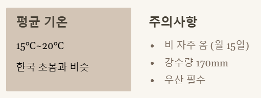 보슬비가 내리는 날이 많아서 우산은 꼭 챙겨야 합니다.