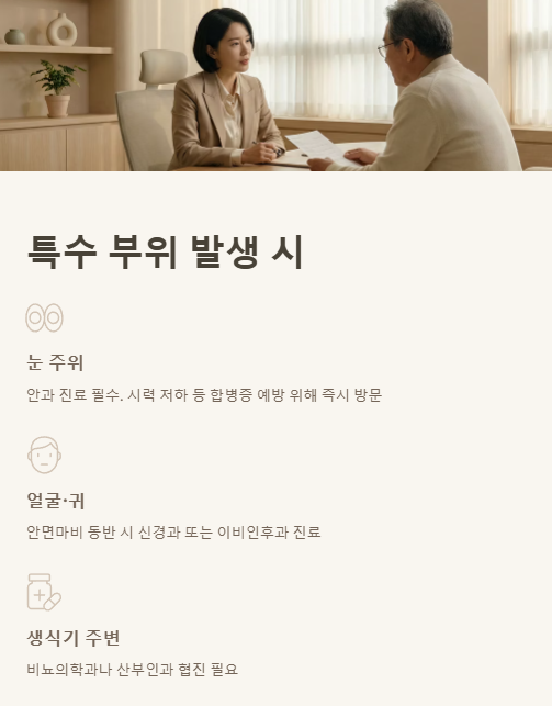 대상포진은 발생 부위나 통증 정도에 따라 추가 전문 진료가 필요할 수 있습니다. 특정 부위 발생 시 해당 전문의와 협진하거나 바로 전문과를 찾는 것이 좋습니다.