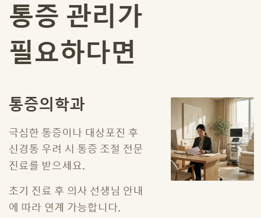 - 통증의학과: 극심한 통증이나 대상포진 후 신경통 우려 시 통증 조절 의뢰.