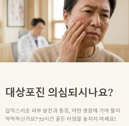 💡 대상포진 골든 타임: 발진 시작 후 72시간(3일) 이내 항바이러스제 치료가 후유증 최소화의 핵심입니다!