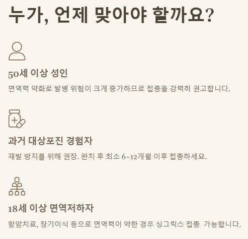 - 18세 이상 면역저하자 (싱그릭스만 해당): 항암치료 중이거나 장기이식 등으로 면역력이 약한 분들은 싱그릭스 접종이 가능합니다. 이 부분은 반드시 의사 선생님과 자세히 상담해 봐야 해요.