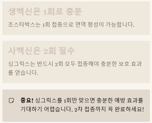 2. 사백신(싱그릭스)은 2회 모두 접종해야 충분한 예방 효과를 볼 수 있습니다.