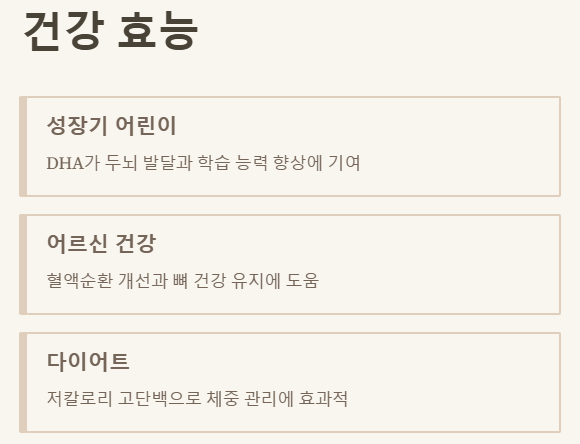 - ✔️ 주요 효능: DHA, EPA 등 불포화지방산 풍부, 뇌 건강 및 혈액순환에 도움.