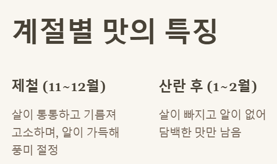 | 1월 ~ 2월 (산란 후) | 살이 빠지고 알이 없어 맛이 덜하다고 여겨지지만, 담백한 맛을 선호하는 분들에게는 좋습니다. |