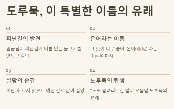 - ✔️ 도루묵 이름의 유래: 임금님이 '도로 물려라' 하신 데서 비롯된 재미있는 이야기.